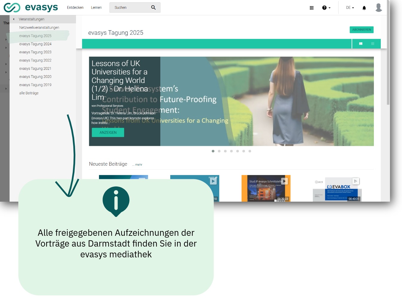 Und da bis September noch ein bisschen Zeit ist, lohnt sich auch ein Blick zurück: Die Videomitschnitte der Vorträge aus Darmstadt 2025 sind in der evasys mediathek zu finden. Das ist eine schöne Gelegenheit, noch einmal in Themen aus dem vergangenen Jahr einzutauchen oder sich schon jetzt auf die nächste Tagung einzustimmen.