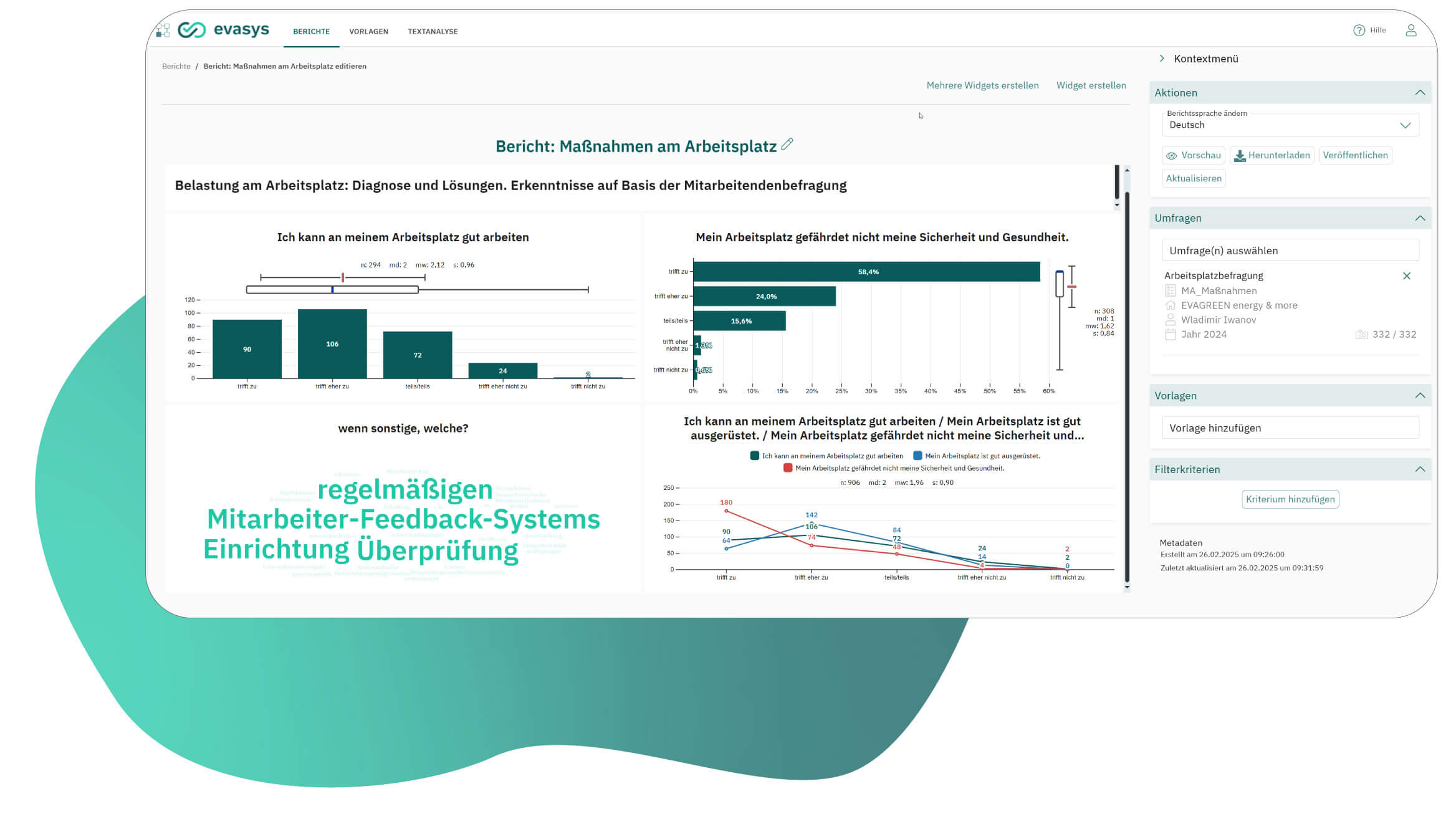 evasys ist die Software für automatisierte und sichere Befragungen im DACH-Raum. Anstatt manuell Daten aus verschiedenen Dokumenten zusammenzutragen, bietet eine Plattform wie evasys eine zentrale, effiziente Lösung. Der hier vorgestellte Muster-Fragebogen zur Mitarbeiterzufriedenheit lässt sich mit wenigen Klicks in evasys importieren und um unternehmensspezifische Fragen erweitern. Die Software automatisiert nicht nur den Versand und die Erinnerungen, sondern übernimmt auch die komplexe Auswertung. So können Sie die Ergebnisse in Echtzeit filtern, vergleichen und in aussagekräftigen Dashboards visualisieren, anstatt Stunden mit Excel-Tabellen zu verbringen.