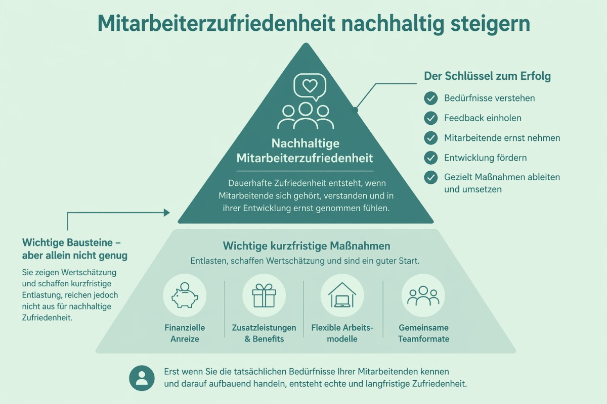 Solche Maßnahmen sind wichtige Bausteine, weil sie entlasten und Wertschätzung zeigen. Für eine tiefgreifende und nachhaltige Mitarbeiterzufriedenheit reichen sie allein jedoch nicht aus. Dauerhafte Zufriedenheit entsteht erst dann, wenn Mitarbeitende sich gehört, verstanden und in ihrer Entwicklung ernst genommen fühlen und Sie ihre tatsächlichen Bedürfnisse kennen, um auf dieser Basis gezielt zu handeln.