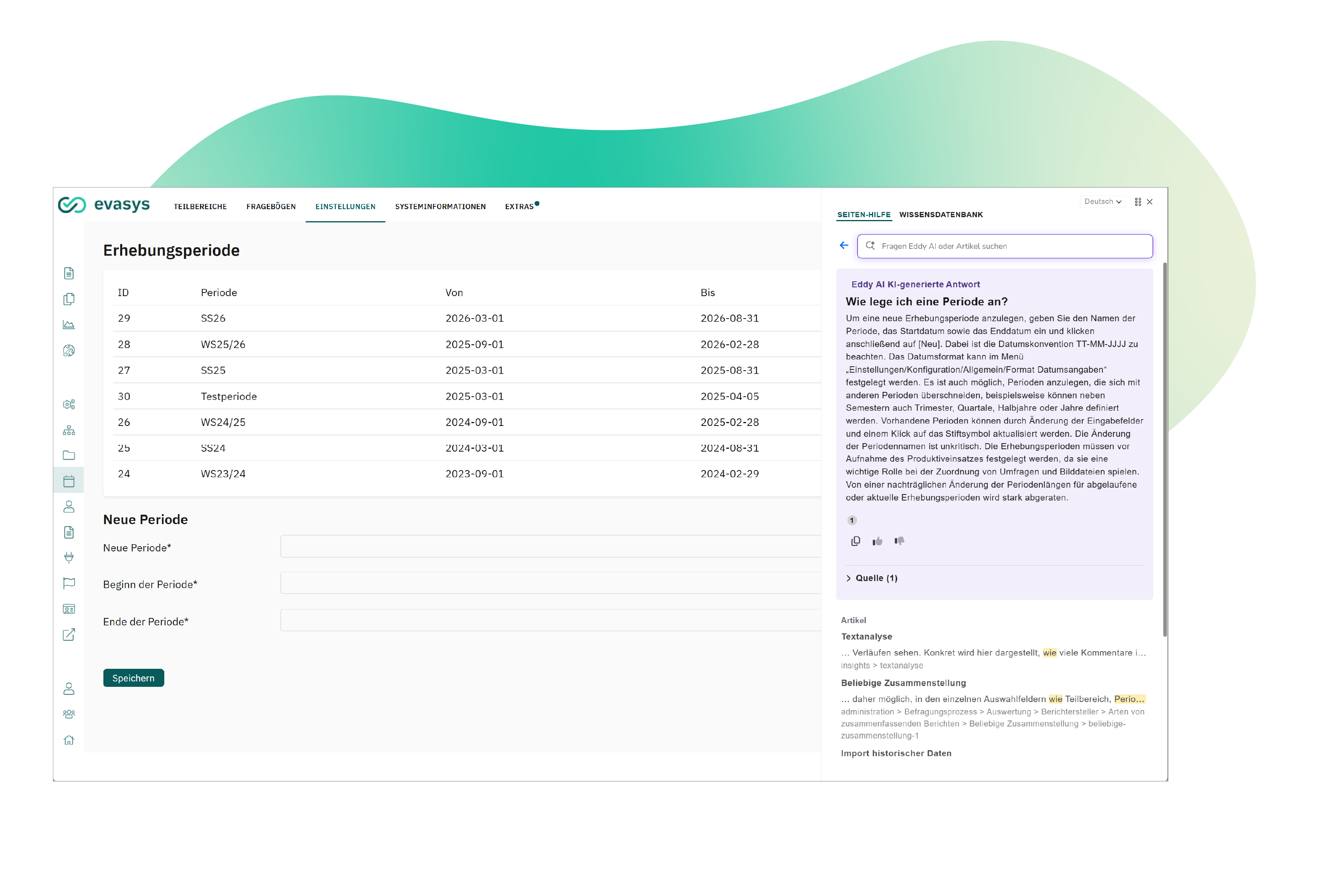 Die Onlinehilfe macht die Arbeit mit evasys und evaexam noch einfacher: Sie steht direkt im Arbeitsbereich zur Verfügung und begleitet die Arbeit kontextnah in allen Menübereichen. Statt lange zu suchen, stehen passende Informationen sofort zur Verfügung – über häufig genutzte Artikel, die strukturierte Wissensdatenbank oder die Suche nach Stichwörtern.